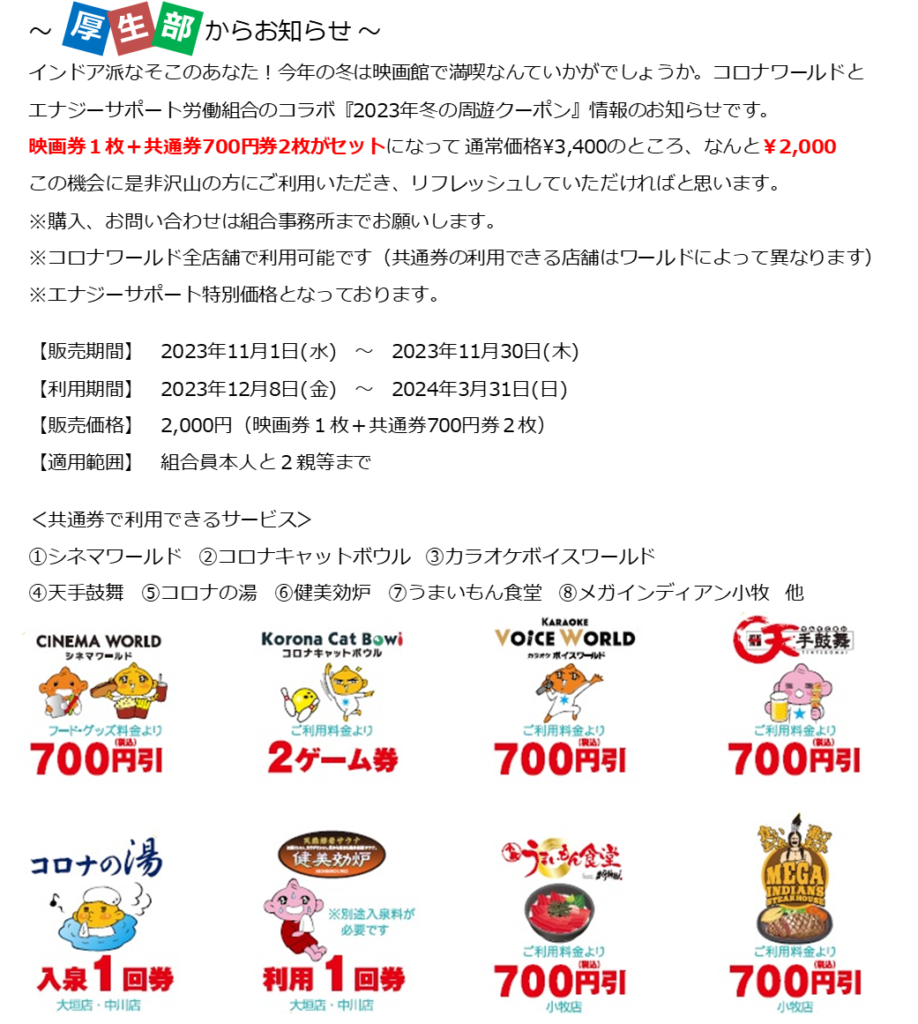 コロナワールド『2023年冬の周遊クーポン』情報