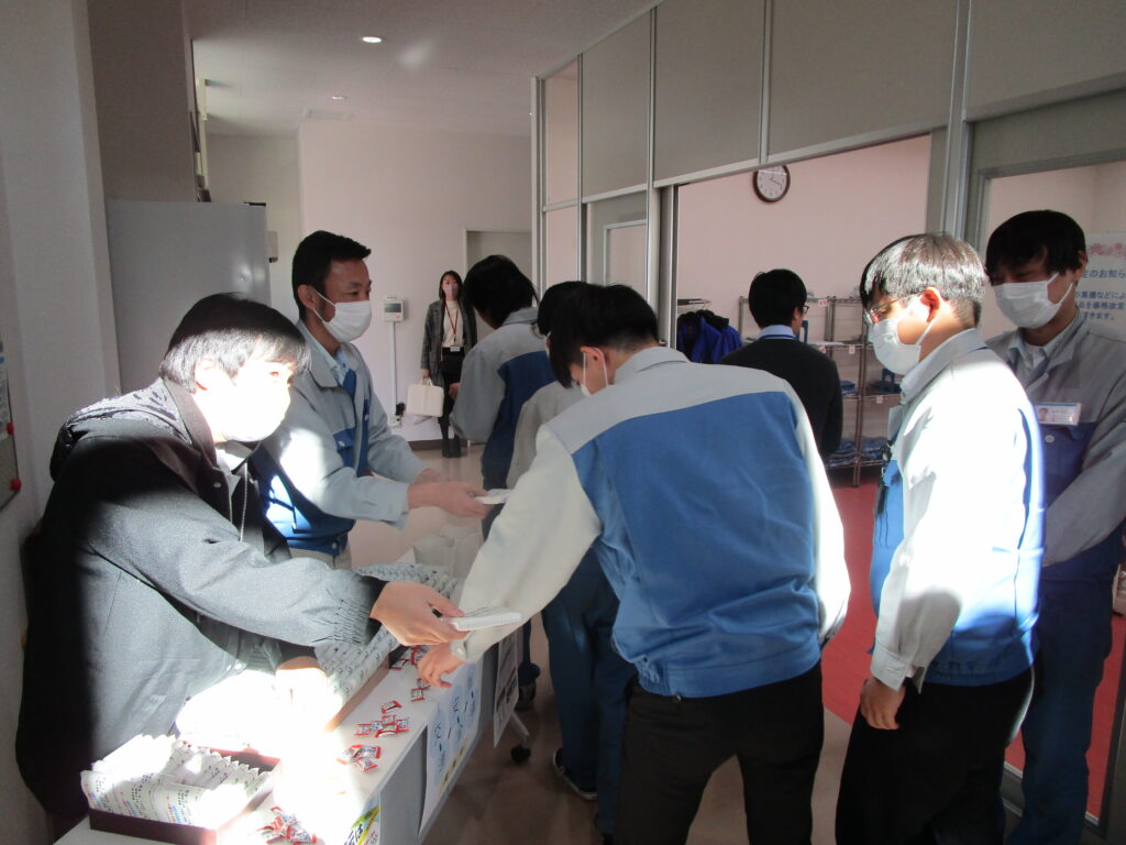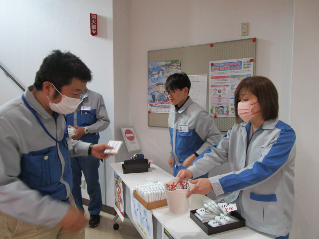 お昼休憩中の時間を活用して、飲酒運転をしないことや運転中の危険についての啓蒙が書かれたビラをポケットティッシュに取付けて配布しました。