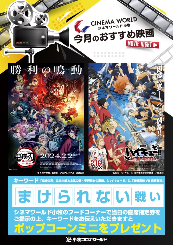 シネマワールド小牧のフードコーナーで、当日の座席指定券を提示の上、キーワードを伝えると「ポップコーンミニ」がもらえちゃいます。現在のキーワードは「まけられない」です。