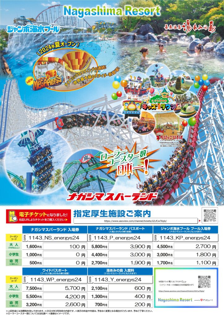 大好評ナガシマスパーランド・湯あみの島割引特典のご案内です。