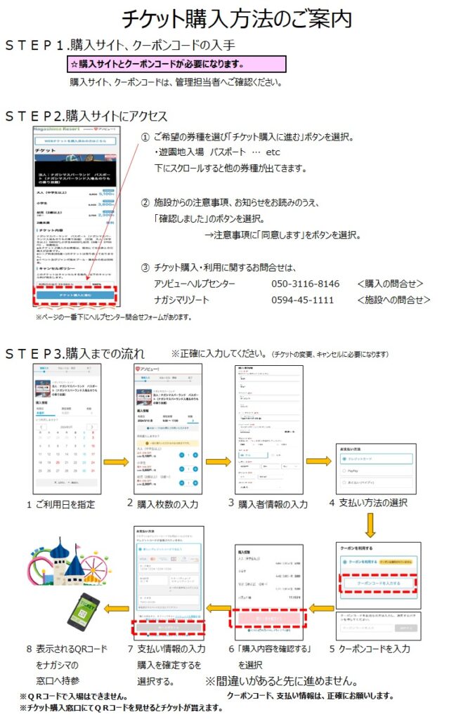・入場のみ、パスポート付、プール入場券、ワイドパスポート、湯あみの島、それぞれクーポンコードが異なりますので、複数種類のチケット購入の際は、チケットごとに決済が必要となります。
