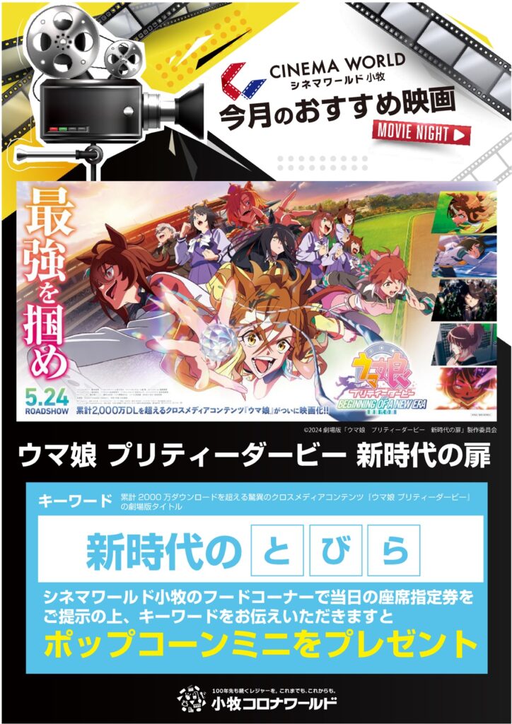 2024.5.14 案内厚生部 コロナワールドよりお得な情報 2024.05 コロナワールドより新しいキーワードを入手しました。 シネマワールド小牧のフードコーナーで、当日の座席指定券を提示の上、キーワードを伝えると「ポップコーンミニ」がもらえちゃいます。5月以降のキーワードは「とびら」です。 厚生部/野口