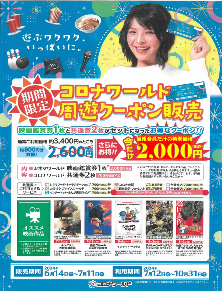 コロナワールドとエナジーサポート労働組合のコラボ『2024年周遊クーポン』情報のお知らせです。