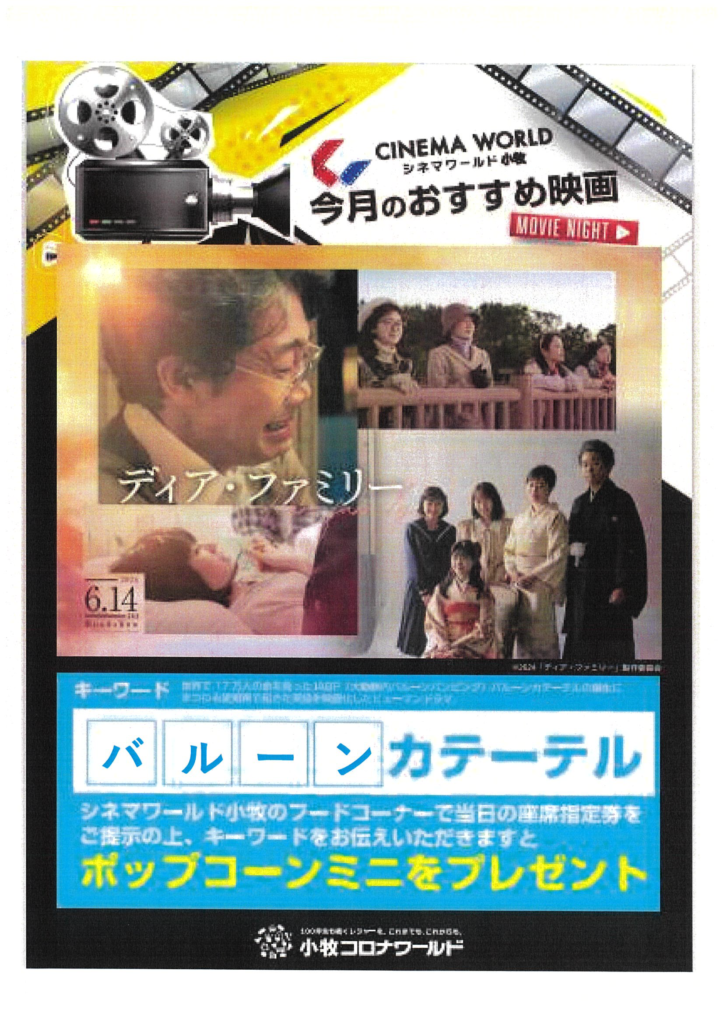 2024.6.13 案内厚生部 コロナワールドよりお得な情報 2024.06 コロナワールドより新しいキーワードを入手しました。 シネマワールド小牧のフードコーナーで、当日の座席指定券を提示の上、キーワードを伝えると「ポップコーンミニ」がもらえちゃいます。6月以降のキーワードは「バルーン」です。 厚生部/野口