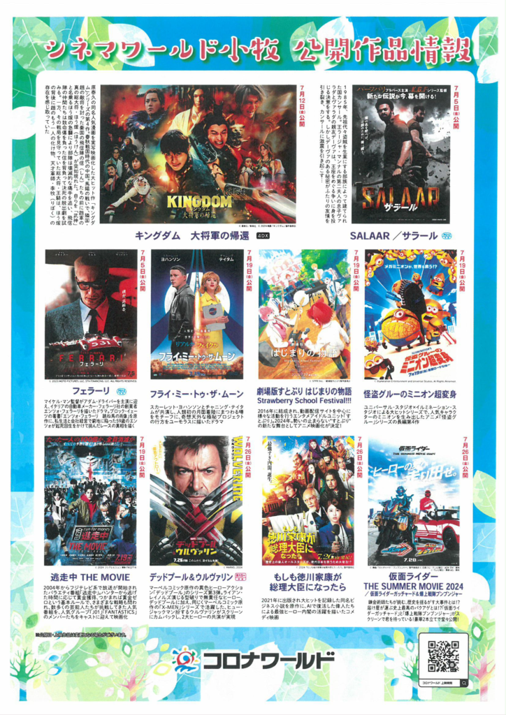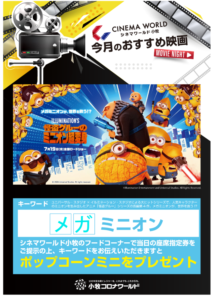 2024.7.04 案内厚生部 コロナワールド映画情報2024.07 コロナワールドより7月公開作品情報を入手しました。 シネマワールド小牧のフードコーナーで、当日の座席指定券を提示の上、キーワードを伝えると「ポップコーンミニ」がもらえちゃいます。7月以降のキーワードは「メガ」です。 厚生部/野口