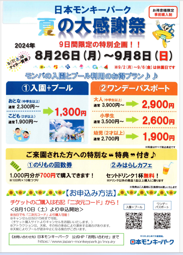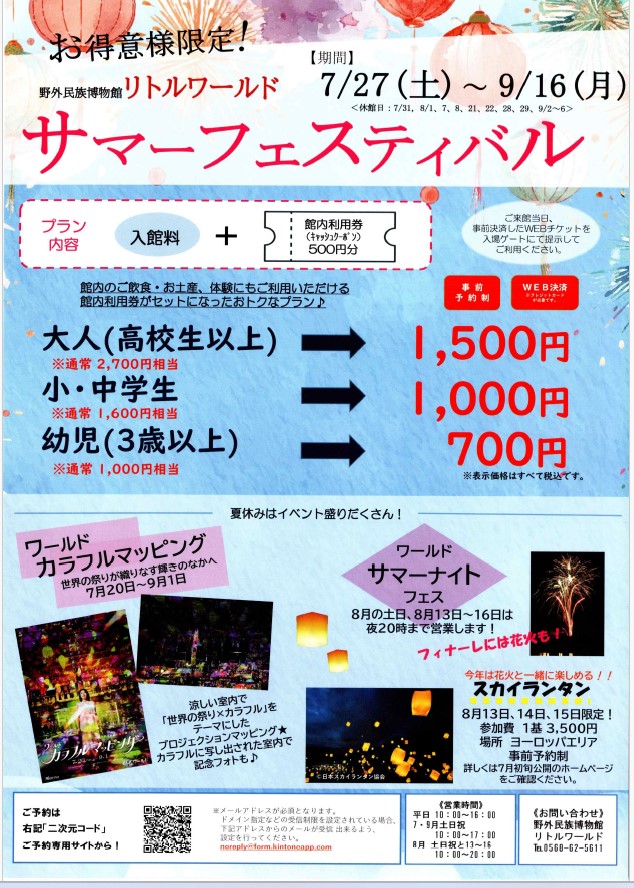 2024.8.05 案内その他 【特別案内】リトルワールド&日本モンキーパーク 「野外民族博物館リトルワールド」・「日本モンキーパーク」よりお得意様限定の特別案内のお知らせです♪ いずれも事前購入制となっております! 開催期間や料金等、詳細はチラシをご覧ください👇