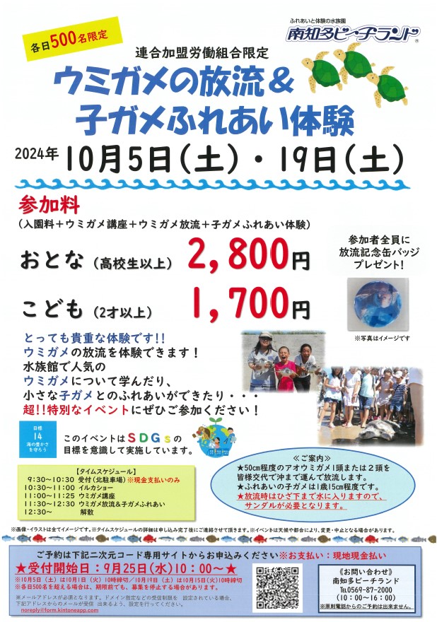 2024年10月5日(土)・19日(土)に「ウミガメの放流&子ガメふれあい体験」が開催されます。