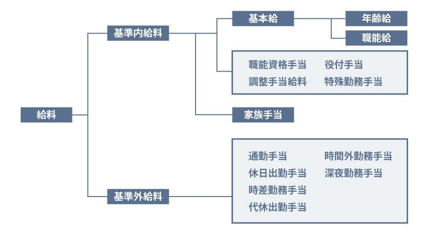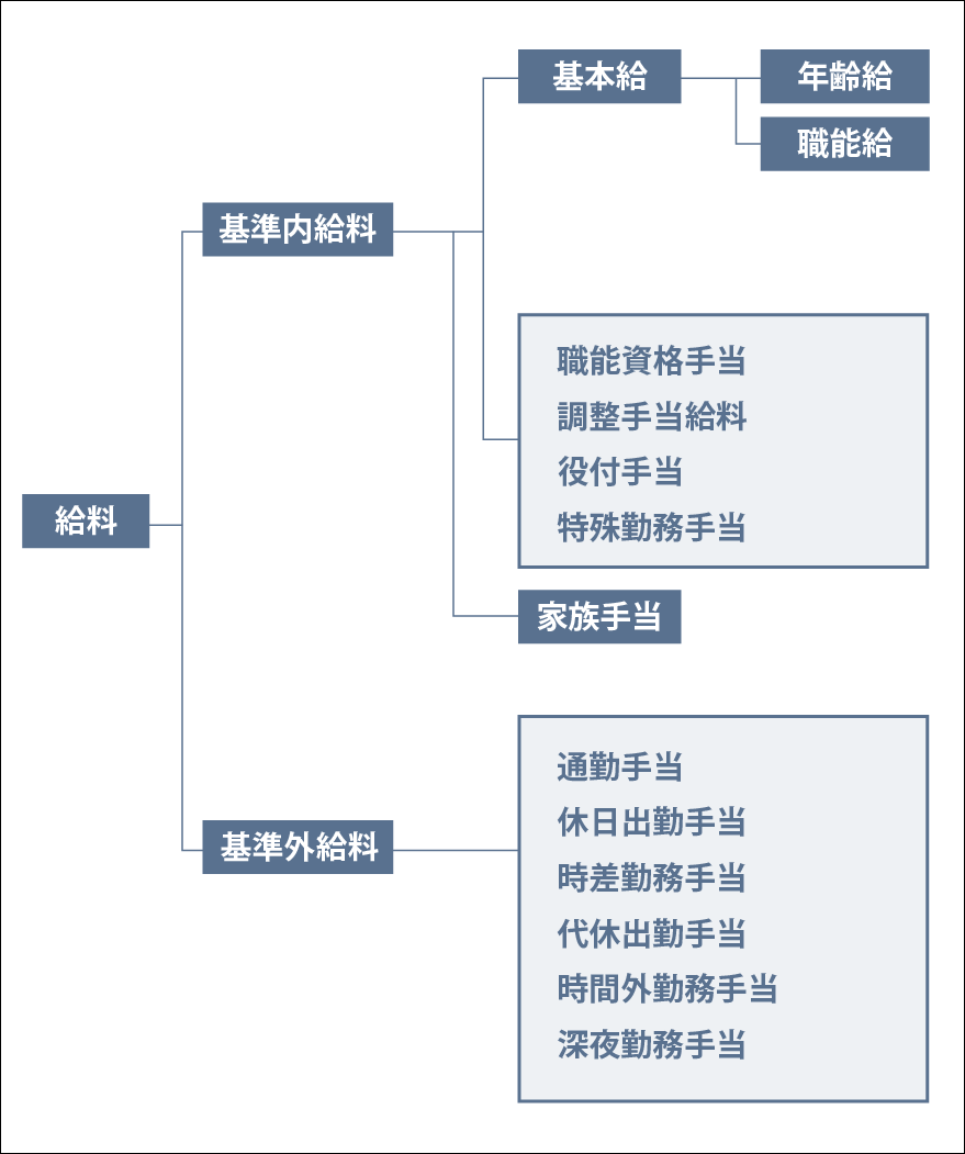 基準内給料と基準外給料に分けられる。給与体系は下図の通り。